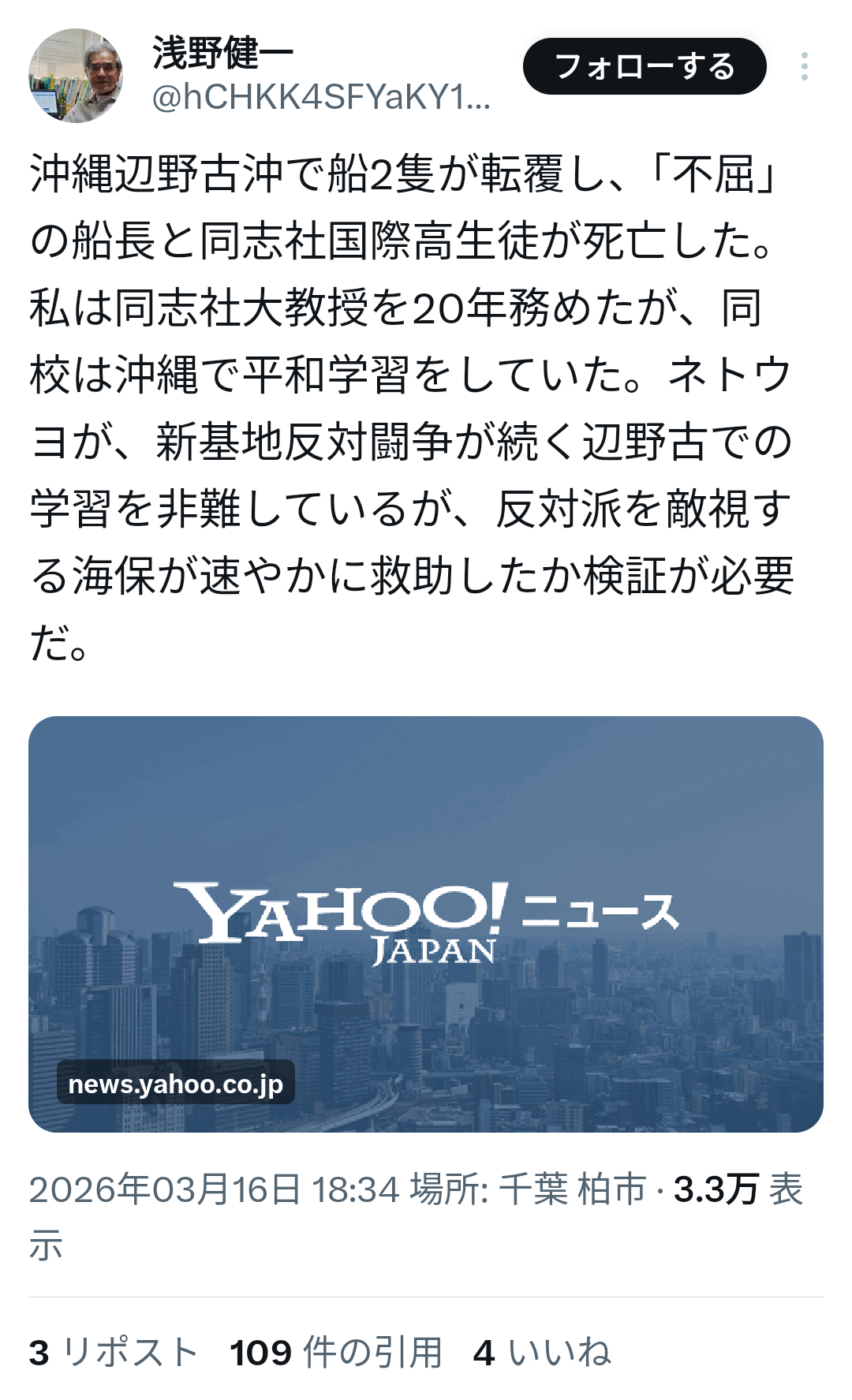 【辺野古】海保「危ないので注意してください!」活動家「…」→その後転覆していた Twitter Facebook はてブ LINE コピー 2026.03.17 スポンサーリンク 1:ザナミビル(庭)[ニダ]:2026/03/17(火) 02:52:15.76 ID:DutQcR500 BE:158879285-PLT(16151) 事故の前に、現場の警戒に当たっていた海保の職員がメガホンで「気象、海象が危ないので注意してください」と呼びかけていたという。https://mainichi.jp/articles/20260316/k00/00m/040/264000c 3:レムデシビル(大阪府)[US]:2026/03/17(火) 03:02:38.93 ID:nWh7FACK0 検証が必要だぞ 続きを読む