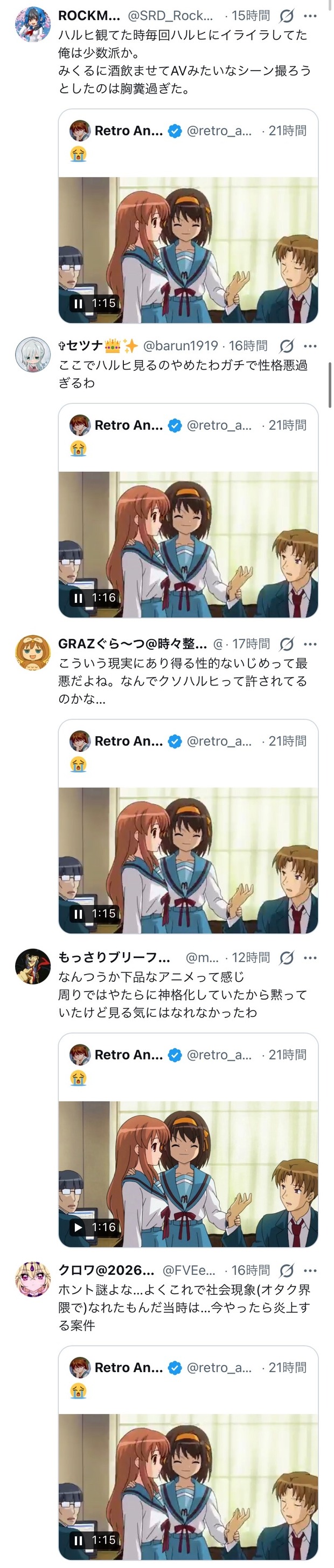【悲報】20年前のアニメ「涼宮ハルヒの憂鬱」、今になって炎上wwwwwwwwwwwwwwwwwwwwwwwww Twitter Facebook はてブ LINE コピー 2026.03.18 スポンサーリンク 1 : 以下、?ちゃんねるからVIPがお送りします :2026/03/17(火) 16:08:18.802 ID:RGDM2AiX0.net😭 pic.twitter.com/EKJxbYo8tO— Retro Anime (@retro_anime) March 16, 2026Xの反応転載元スレッド:https://viper.2ch.sc/test/read.cgi/news4vip/1773731298/ 続きを読む