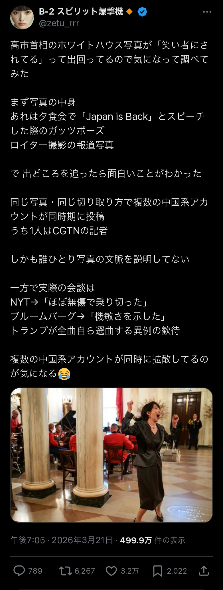 【速報】X民「高市早苗の熱唱画像の出処、中国人」←3.2万いいねwwwww Twitter Facebook はてブ LINE コピー 2026.03.22 スポンサーリンク 1:それでも動く名無し:2026/03/22(日) 11:50:36.48 ID:LEqpUkTCd.net 3:それでも動く名無し:2026/03/22(日) 11:52:55.06 ID:KF6sMUSw0.net 何を言うてるんや… 7:それでも動く名無し:2026/03/22(日) 11:54:30.54 ID:tQlCV/6I0.net ホワイトハウスは中国系だった…? 続きを読む