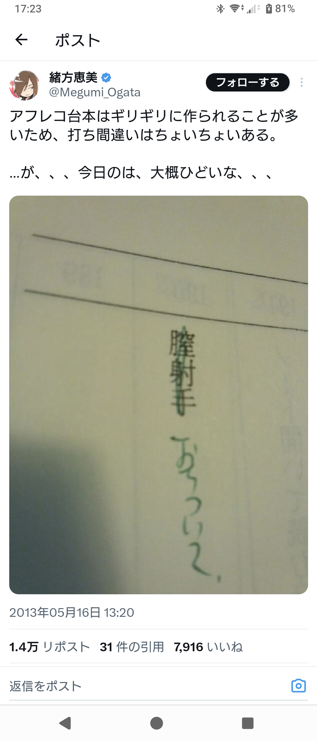 有名女性声優、えっちな台本を渡されて赤面 (※画像あり) Twitter Facebook はてブ LINE コピー 2026.03.25 スポンサーリンク 1:それでも動く名無し:2026/03/24(火) 17:24:35.95 ID:by1wVSmV0 2:それでも動く名無し:2026/03/24(火) 17:26:11.72 ID:vc/8tEv5M これは激臭 3:それでも動く名無し:2026/03/24(火) 17:26:21.90 ID:YwYirHb80 なんて読むんや 4:それでも動く名無し:2026/03/24(火) 17:27:20.36 ID:VmuaACNL0 (お)ちついて 続きを読む