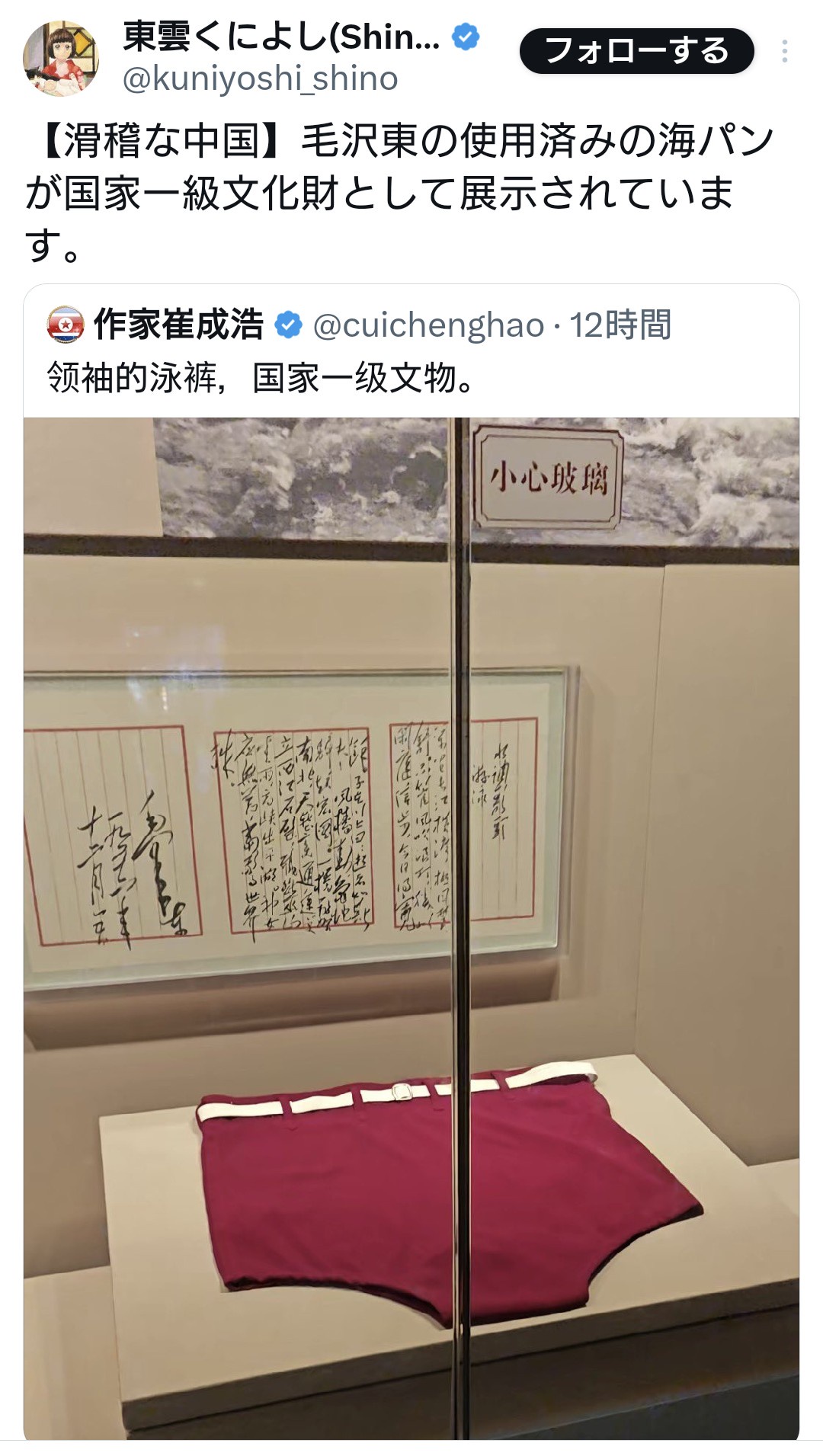 【滑稽な中国】毛沢東の使用済みの海パンが国家一級文化財として展示されています。 https://t.co/qU7Cc650Kd