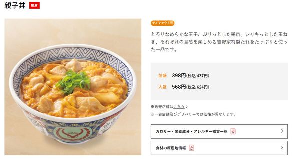 同社が開示している「食材の原産地情報」によると、鶏肉にはタイ産、玉ねぎは中国産を使用しているという。価格はそれぞれ437円(並盛)、624円(大盛)。
