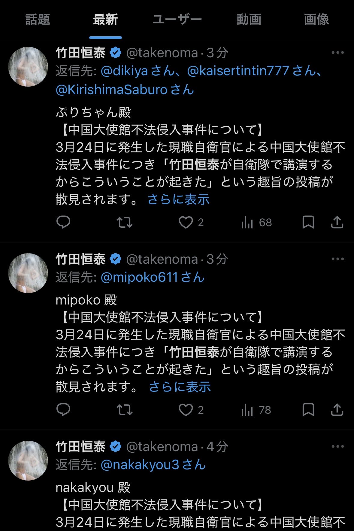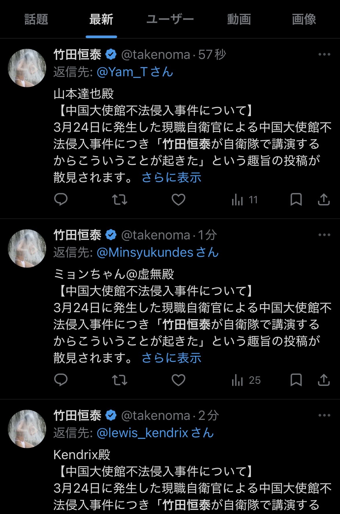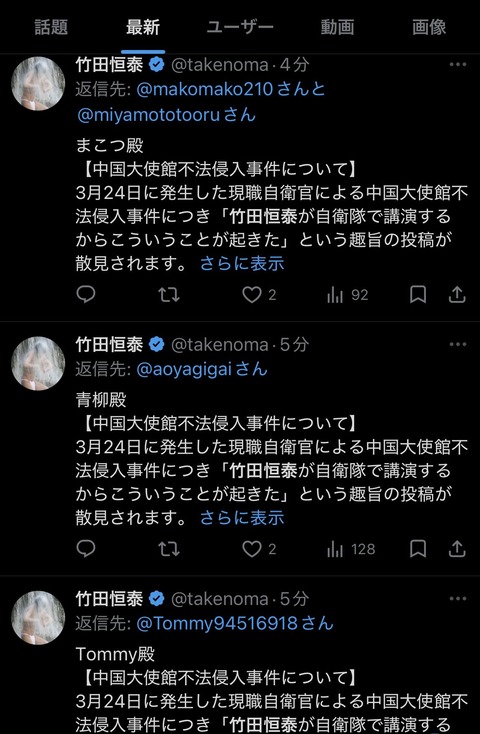 【悲報】自衛隊講師・竹田恒泰、自衛隊員の中国大使館カチコミに焦りまくるwwwwwww Twitter Facebook はてブ LINE コピー 2026.03.25 スポンサーリンク 1:それでも動く名無し:2026/03/25(水) 07:26:22.34 ID:aaK9adZy0.net 笑っちゃうわこんなん 2:それでも動く名無し:2026/03/25(水) 07:27:54.27 ID:nfSmcwOA0.net なんでスパム返信してるの?こいつ 3:それでも動く名無し:2026/03/25(水) 07:28:41.02 ID:kOrGb9mb0.net どゆこと? 続きを読む