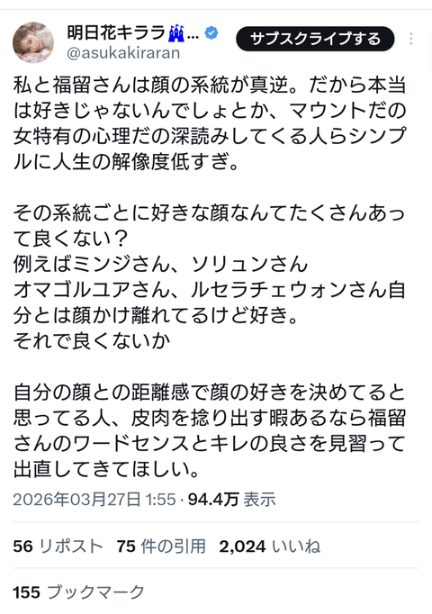 【悲報】明日花キララさん、福留さんと比べられてお気持ち表明wwww (※画像あり) Twitter Facebook はてブ LINE コピー 2026.03.27 スポンサーリンク 1:それでも動く名無し:2026/03/27(金) 13:51:18.82 ID:LXO1rw2A0 4:それでも動く名無し:2026/03/27(金) 13:52:07.23 ID:/SCW3/QS0 こえー顔だな相変わらず 5:それでも動く名無し:2026/03/27(金) 13:54:01.87 ID:Av/pl6xq0 口は災いの元だぞ 続きを読む