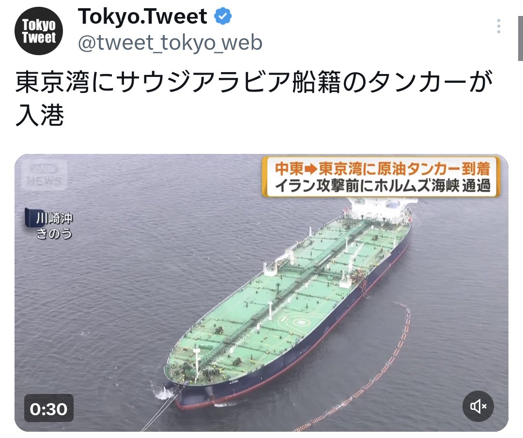 東京湾にサウジアラビア船籍のタンカーが入港 Twitter Facebook はてブ LINE コピー 2026.03.27 スポンサーリンク 1:2026/03/27(金) 13:04:46.52 ID:dBdTBCO40東京湾にサウジアラビア船籍のタンカーが入港 pic.twitter.com/y8S1OuUxZi— Tokyo.Tweet (@tweet_tokyo_web) March 26, 2026転載元スレッド:https://hayabusa3.2ch.sc/test/read.cgi/news/1774584286/ 続きを読む