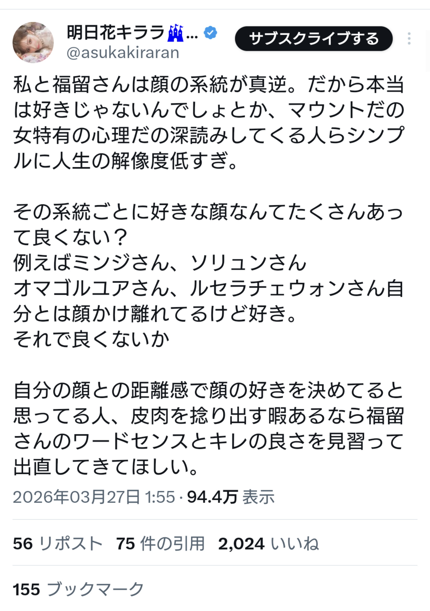【悲報】明日花キララさん、福留さんと比べられてお気持ち表明wwwww (※画像あり) Twitter Facebook はてブ LINE コピー 2026.03.27 スポンサーリンク 1:それでも動く名無し:2026/03/27(金) 13:51:18.82 ID:LXO1rw2A0.net 2:それでも動く名無し:2026/03/27(金) 13:51:50.44 ID:g0aUmM9N0.net また負けたのか 続きを読む