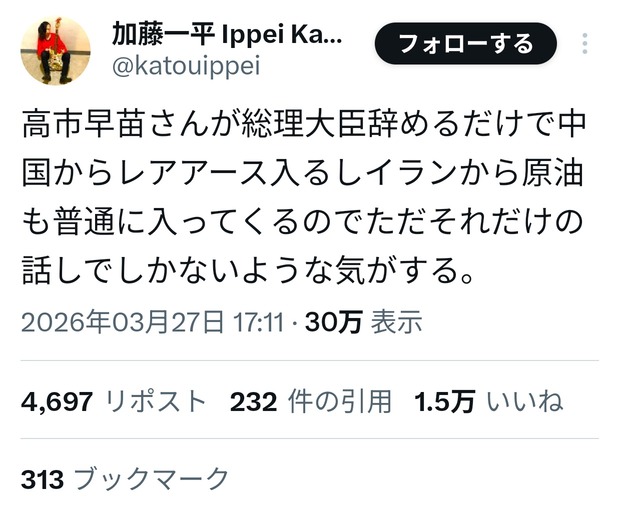 高市早苗さんが総理大臣辞めるだけで中国からレアアース入るしイランから原油も普通に入ってくるのでただそれだけの話しでしかないような気がする。