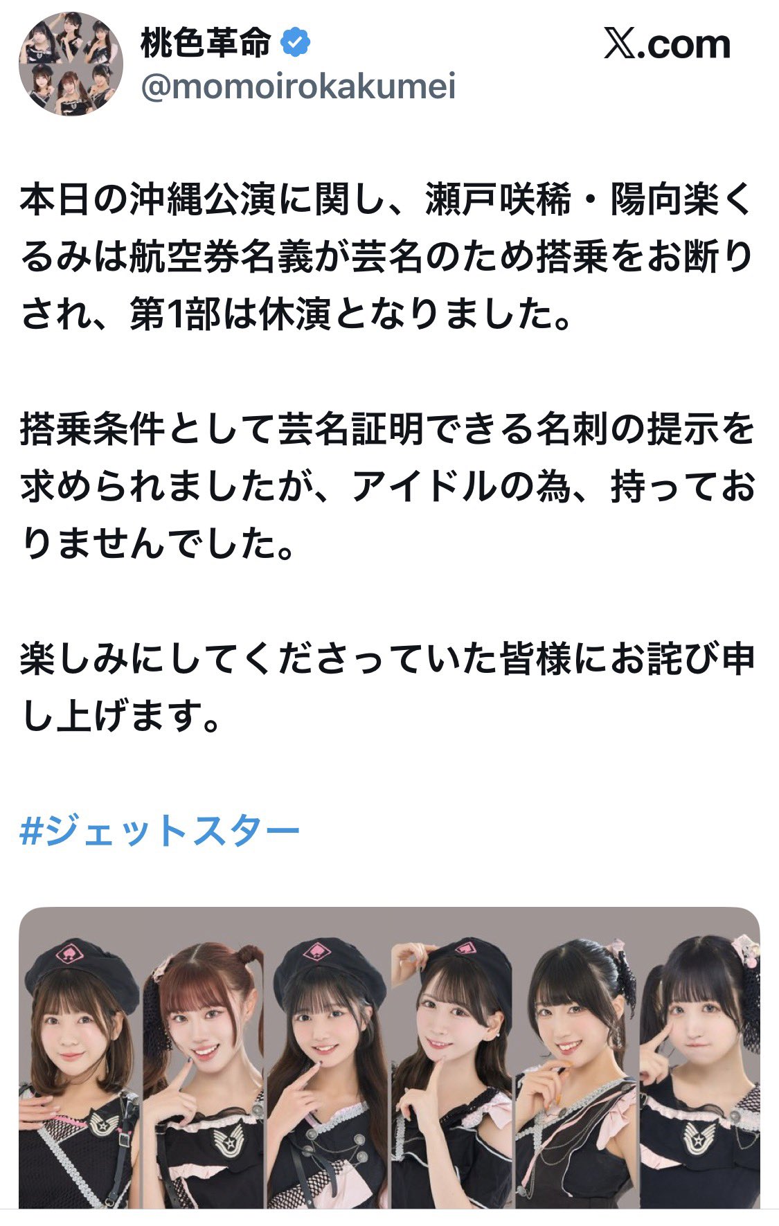 航空券の名義が「芸名」だったため、飛行機に乗れず公演の一部が休演――。アイドルグループ「桃色革命」の公式X(旧ツイッター)が28日投稿した報告が、ネット上で大きな波紋を広げている。
