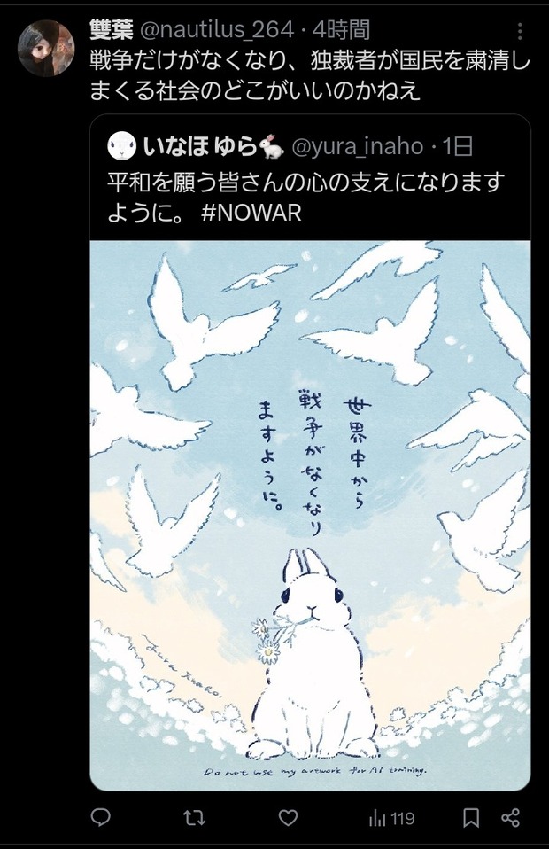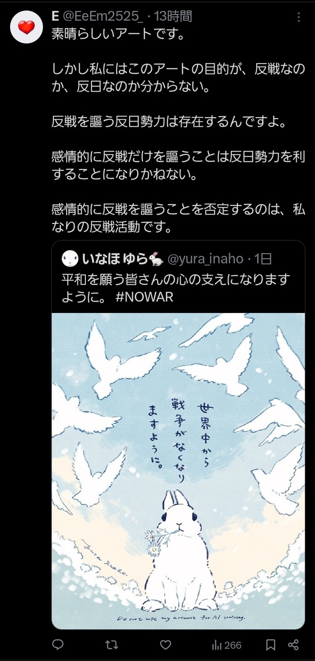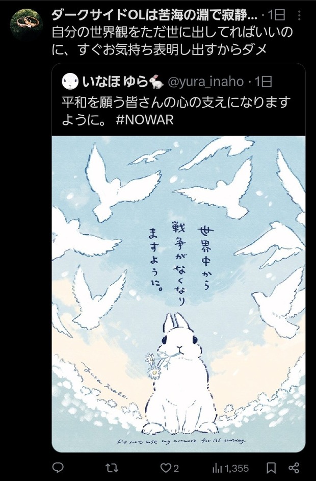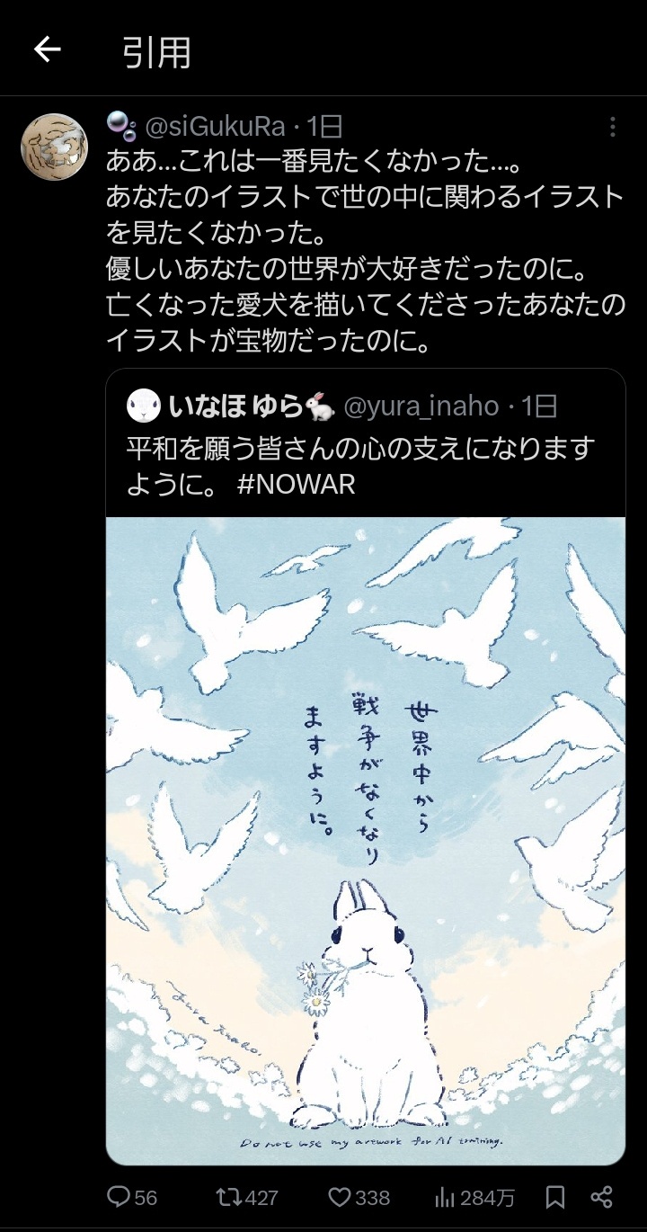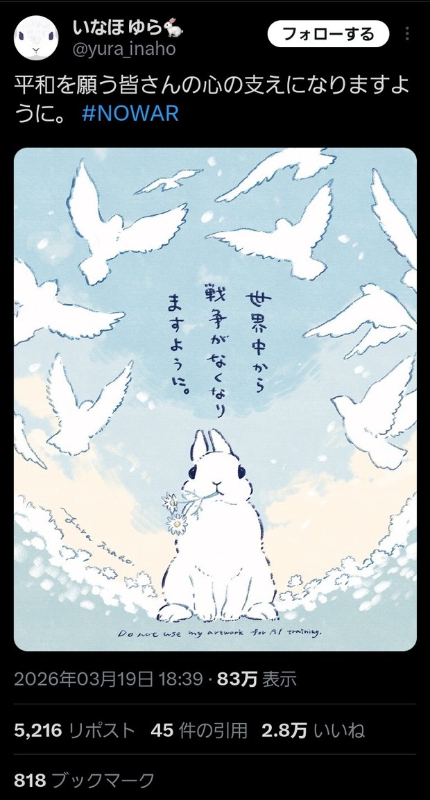【悲報】有名イラストレーター「世界中から戦争がなくなりますように」👈炎上 Twitter Facebook はてブ LINE コピー 2026.03.29 スポンサーリンク 1 : 以下、?ちゃんねるからVIPがお送りします :2026/03/28(土) 19:29:46.592 ID:JCsnY19H0.netウサギの反戦イラストに「自己満」批判→制作者が削除・謝罪も... 「戦争反対」イラストを絵師が続々投稿: J-CAST ニュース【全文表示】https://www.j-cast.com/2026/03/25513181.html?p=all転載元スレッド:https://viper.2ch.sc/test/read.cgi/news4vip/1774693786/ 続きを読む