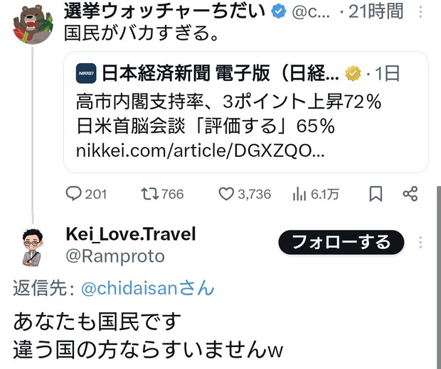 高市内閣の支持率上昇に著名パヨクさん「国民がバカすぎる」 Twitter Facebook はてブ LINE コピー 2026.03.30 スポンサーリンク 1:2026/03/30(月) 19:50:54.24 ID:g5NcW90F0高市内閣の支持率上昇に、選挙ウォッチャーちだい氏「国民がバカすぎる」 https://t.co/swxCT6qZGS— 話題のニュースとネットの反応 (@sharenewsjapan1) March 30, 2026転載元スレッド:https://hayabusa3.2ch.sc/test/read.cgi/news/1774867854/ 続きを読む