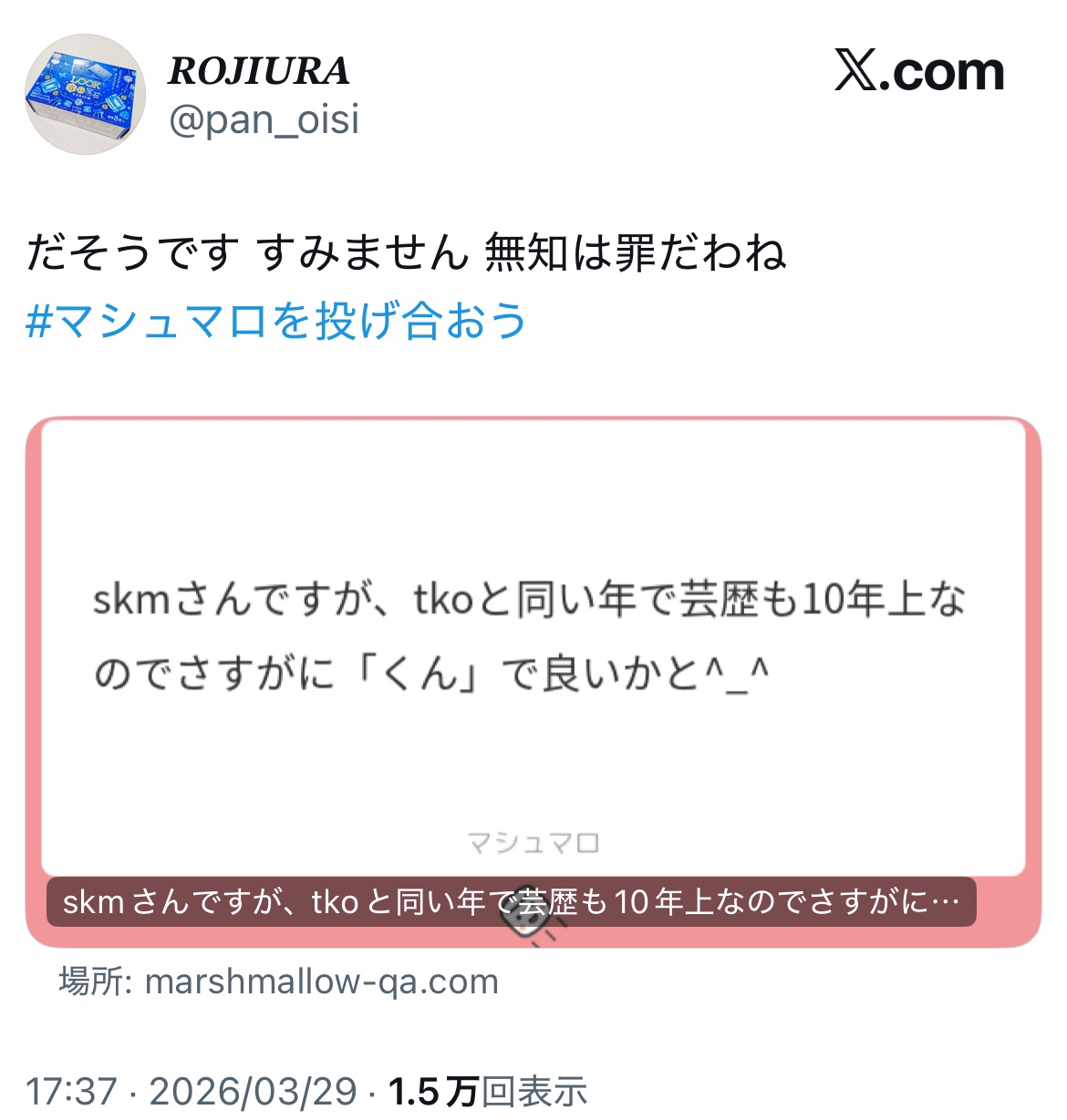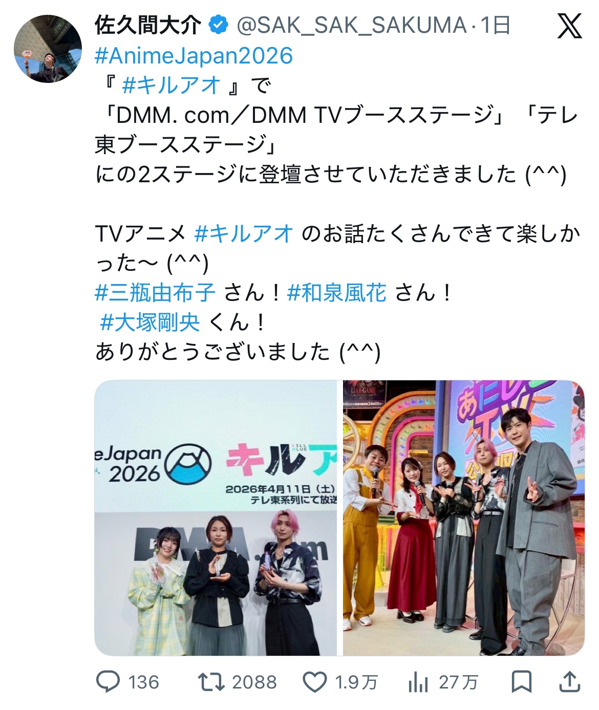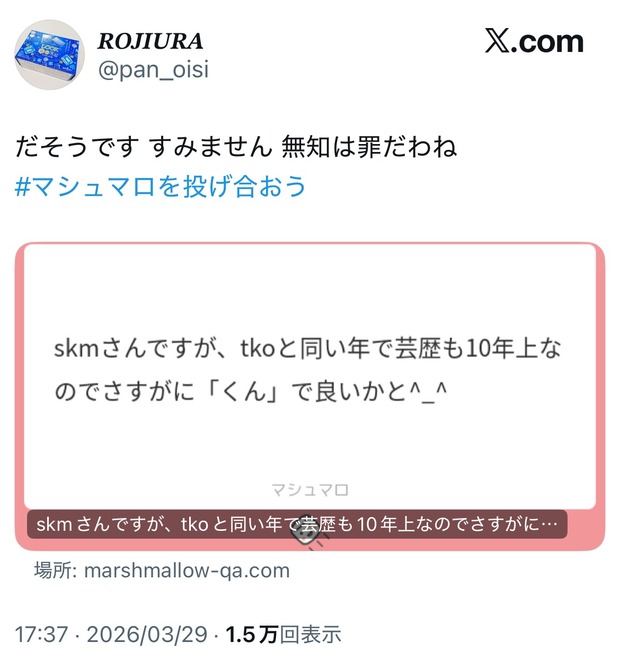 【悲報】ジャニーズさん、声優をくん付けして大炎上www Twitter Facebook はてブ LINE コピー 2026.03.31 スポンサーリンク 1 : 以下、?ちゃんねるからVIPがお送りします :2026/03/30(月) 20:17:31.374 ID:Qc4aknf20.nethttps://x.com/pan_oisi/status/2038173591716721018転載元スレッド:https://viper.2ch.sc/test/read.cgi/news4vip/1774869451/ 続きを読む