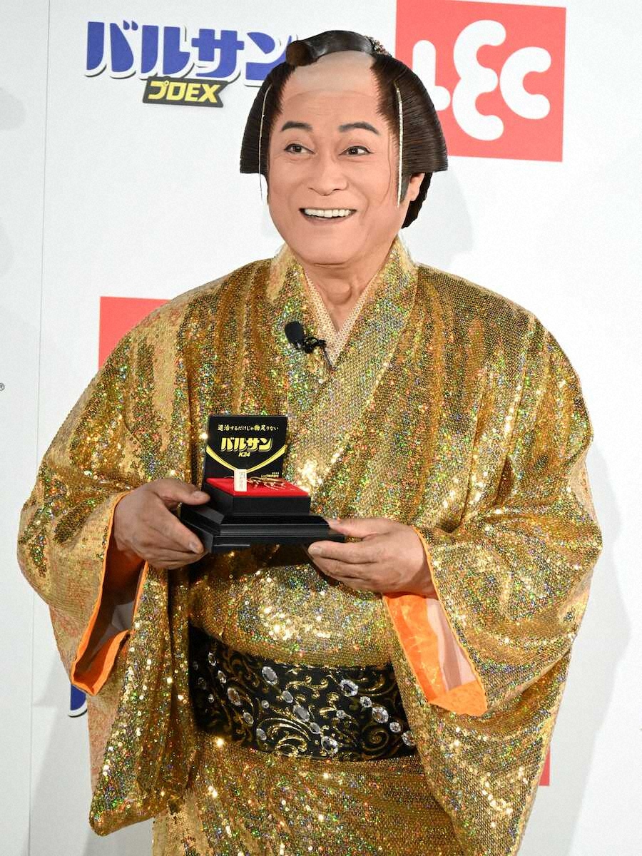 100万円相当の純金ゴキブリを授与され、笑顔を見せる松平健(撮影・松尾 知香)