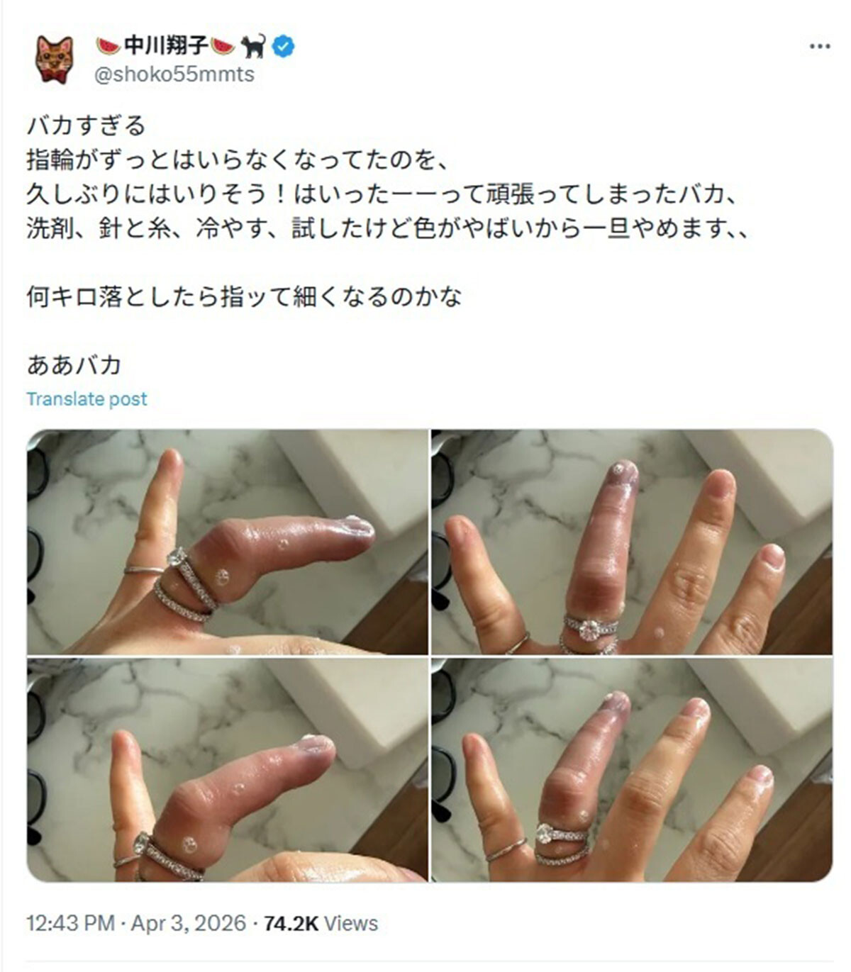 【悲報】中川翔子さん、大変なことになる😭😭😭 (※画像あり) Twitter Facebook はてブ LINE コピー 2026.04.06 スポンサーリンク 1:それでも動く名無し:2026/04/05(日) 00:40:49.15 ID:JuXNdkCu0 2:それでも動く名無し:2026/04/05(日) 00:42:18.69 ID:1xuW10gO0 あんまりにもこの救急通報が多いため指輪切る専用工具あるから大丈夫やで 4:それでも動く名無し:2026/04/05(日) 00:43:39.40 ID:+YzKYqtH0 これが怖いから指輪は絶対付けない なんでみんな平気で付けれるんや 続きを読む