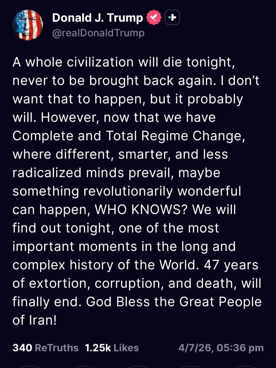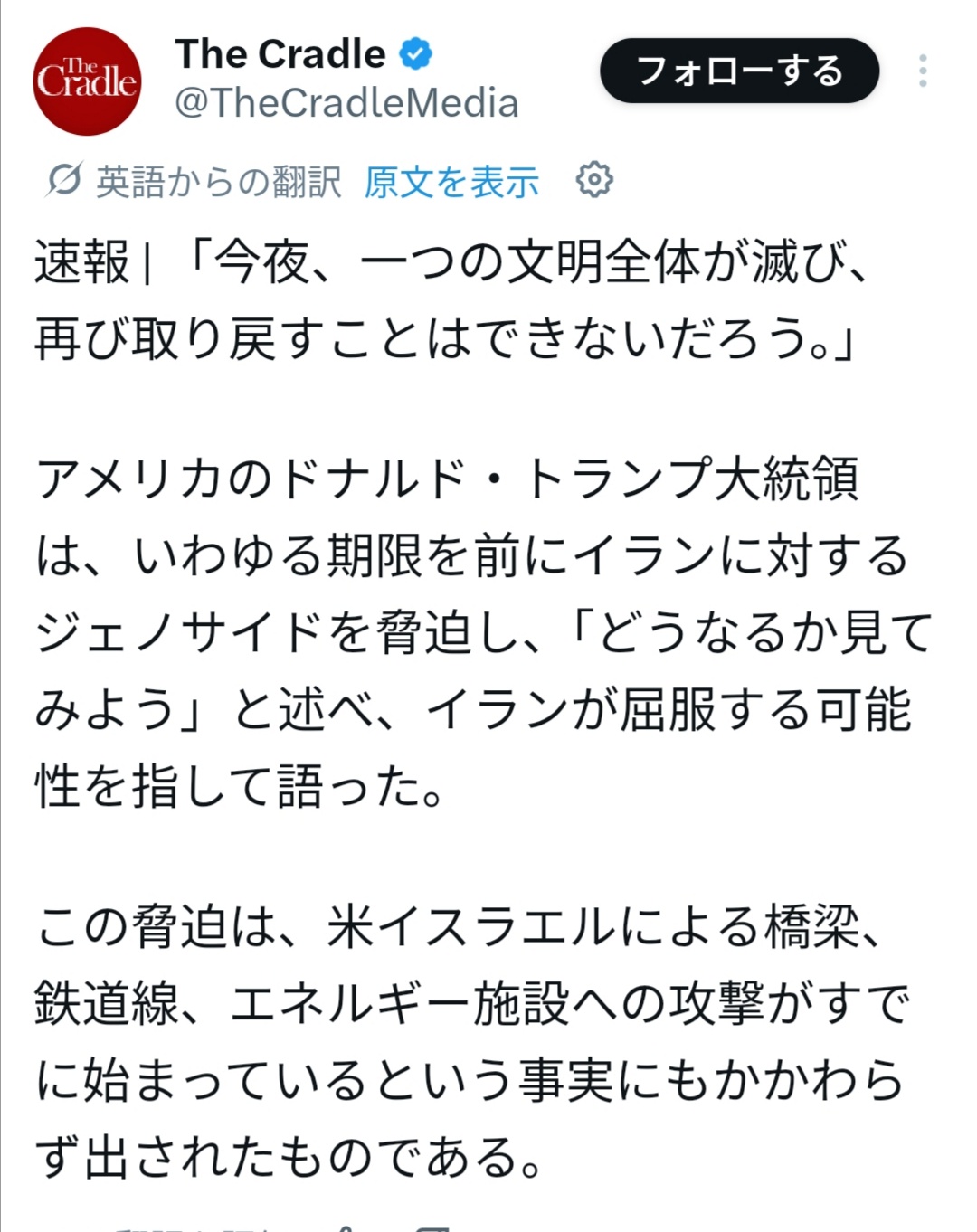 【速報】ドナルド・トランプさん、イランに対して核兵器を使用しようとしている可能性 Twitter Facebook はてブ LINE コピー 2026.04.07 スポンサーリンク 1:それでも動く名無し:2026/04/07(火) 21:30:42.04 ID:8P4qXDsU0 一つの文明全体が今夜死ぬだろう。二度と取り戻されることはない。私はそれが起きてほしくないが、おそらく起きるだろう。 2:それでも動く名無し:2026/04/07(火) 21:30:54.40 ID:8P4qXDsU0 終わりやね 3:それでも動く名無し:2026/04/07(火) 21:31:03.50 ID:8P4qXDsU0 戦争や 続きを読む