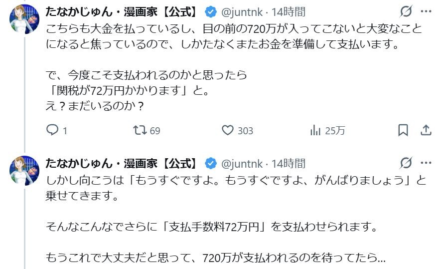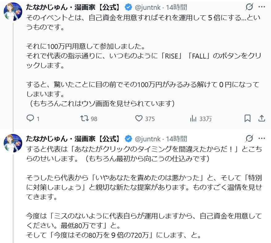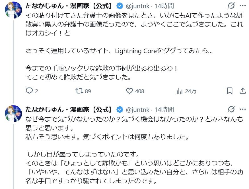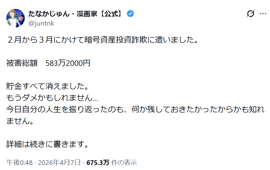 60歳人気漫画家が「暗号資産投資詐欺」に遭ったと報告、被害額も公開「貯金すべて消えました」