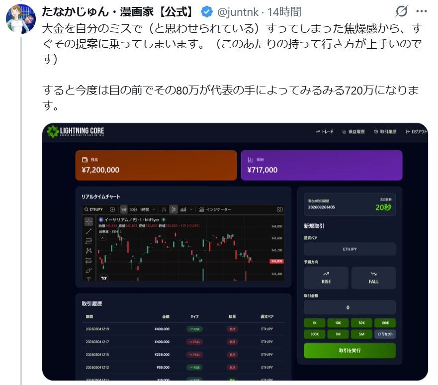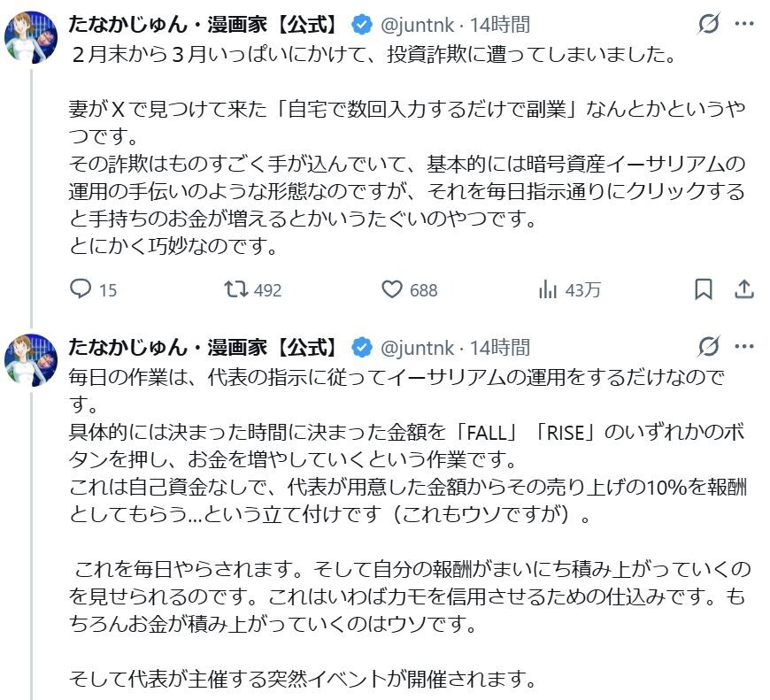 「2月末から3月いっぱいにかけて、投資詐欺に遭ってしまいました。妻がXで見つけて来た『自宅で数回入力するだけで副業』なんとかというやつです。その詐欺はものすごく手が込んでいて、基本的には暗号資産イーサリアムの運用の手伝いのような形態なのですが、それを毎日指示通りにクリックすると手持ちのお金が増えるとかいうたぐいのやつです。とにかく巧妙なのです」と記述。