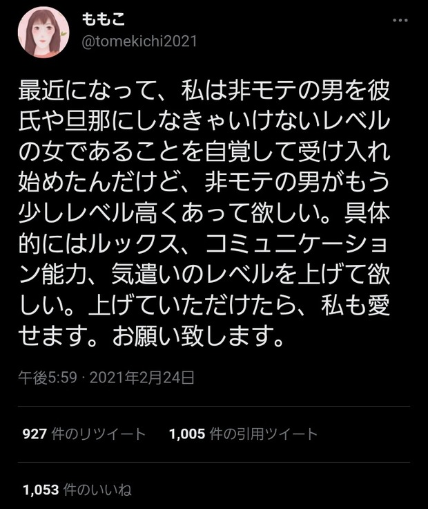 最近になって、私は非モテの男を彼氏や旦那にしなきゃいけないレベルの女であることを自覚して受け入れ始めたんだけど、非モテの男がもう少しレベル高くあって欲しい。具体的にはルックス、コミュニケーション能力、気遣いのレベルを上げて欲しい。上げていただけたら、私も愛せます。お願い致します。