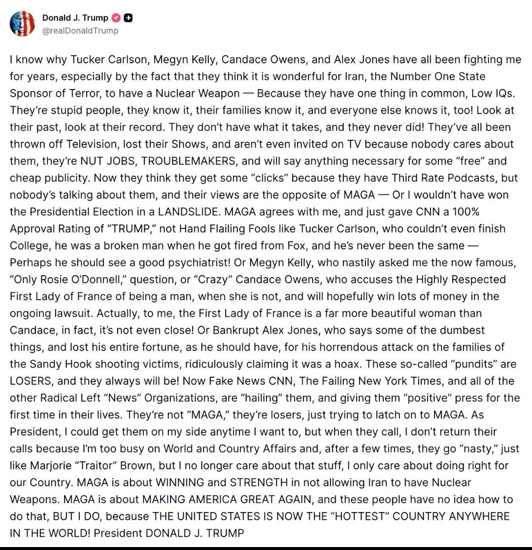 トランプさん、なんか病んで意味不明の長文をアップしてしまう😭 Twitter Facebook はてブ LINE コピー 2026.04.10 スポンサーリンク 1: それでも動く名無し 2026/04/10(金) 17:41:37.07 ID:ZWwGgDcrr こわい 最近トランプが狂いすぎてるので元の仲間がトランプを批判して敵になる ↓ 狂ったようにそいつらを罵る長文アップ 続きを読む