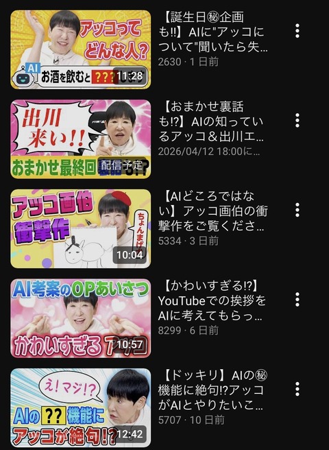 【悲報】和田アキ子さんのYouTube、ガチでヤバいwwwwwwwwwwwww Twitter Facebook はてブ LINE コピー 2026.04.12 スポンサーリンク 1:それでも動く名無し:2026/04/12(日) 10:25:22.09 ID:08WkzQ1O0.net https://m.youtube.com/@akko_AI/videos 2:それでも動く名無し:2026/04/12(日) 10:25:40.96 ID:08WkzQ1O0.net 登録者数 3450人 続きを読む