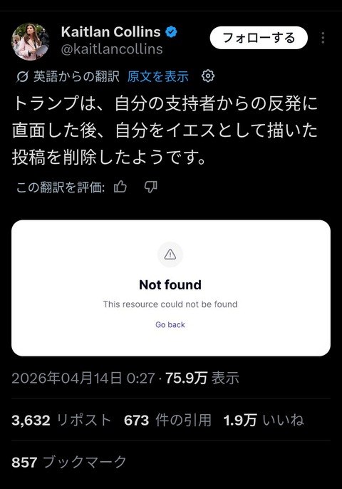 トランプさん、叩かれ過ぎて自分をキリストにした画像削除wwwwwwww Twitter Facebook はてブ LINE コピー 2026.04.14 スポンサーリンク 1:それでも動く名無し:2026/04/14(火) 11:31:57.98 ID:2vZaPutar.net トランプが自分をキリストにした画像をSNSに投稿 ↓ トランプ信者にすらマジギレされてビビり散らかして削除 2:それでも動く名無し:2026/04/14(火) 11:32:17.77 ID:2vZaPutar.net これはトランプの“負け”やね 3:それでも動く名無し:2026/04/14(火) 11:32:24.77 ID:dxLTlFdO0.net しゃーない 続きを読む
