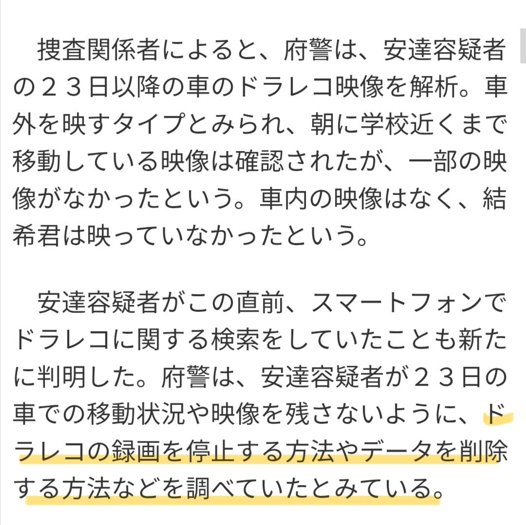 【謎】安達優季(37)が安達結希(11)の死体を3週間隠し通せてたワケ Twitter Facebook はてブ LINE コピー 2026.04.18 スポンサーリンク 1:それでも動く名無し:2026/04/18(土) 12:15:32.95 ID:4K1UQES90 安達優季「息子がいなくなってしまったのですが!」(学校から連絡来る前) 2:それでも動く名無し:2026/04/18(土) 12:16:11.55 ID:4K1UQES90 「ドラレコ 消し方」 続きを読む