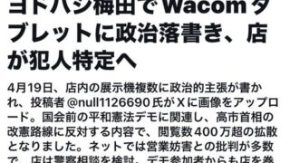 【画像】ヨドバシの展示機に「高市やめろ」と落書きしたパヨク、警察沙汰になる模様 Twitter Facebook はてブ LINE コピー 2026.04.21 スポンサーリンク 1:それでも動く名無し:2026/04/21(火) 14:04:59.21 ID:vBMKLR8L0 元画像 ご尊顔 続きを読む