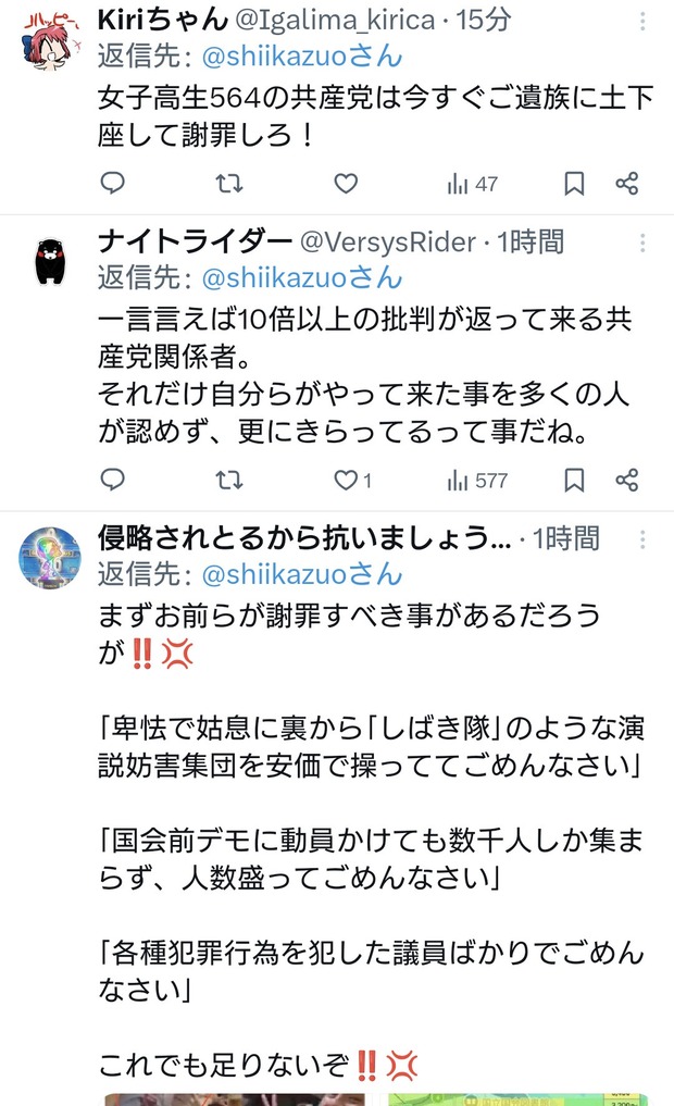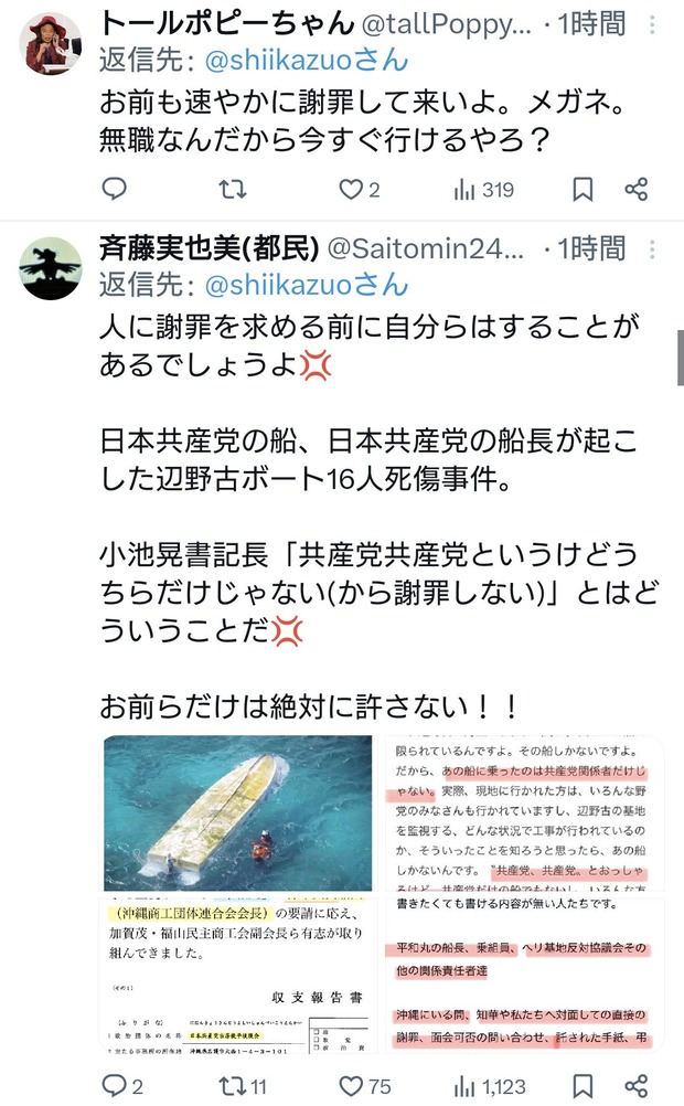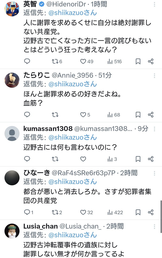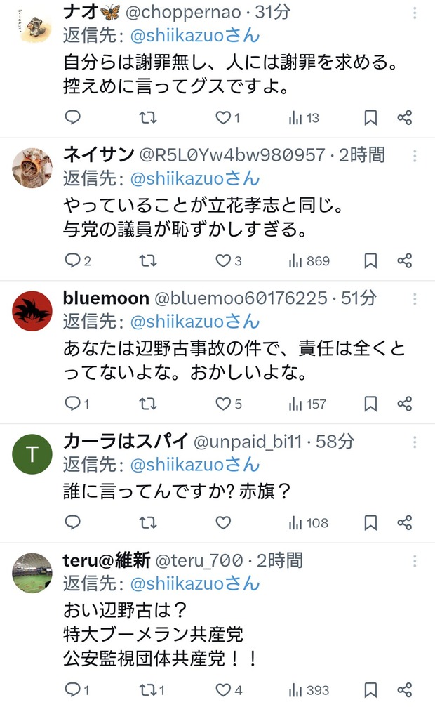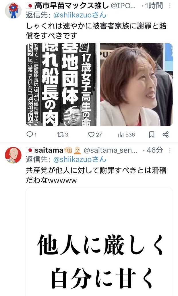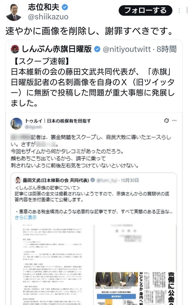 共産党志位氏「日本維新の藤田代表は謝罪すべきです」←お前が先に謝罪しろと総ツッコミ Twitter Facebook はてブ LINE コピー 2026.04.23 スポンサーリンク 2:2026/04/22(水) 22:37:48.64 ID:RBChu2OP0.net速やかに画像を削除し、謝罪すべきです。 https://t.co/H8CYcY01KP— 志位和夫 (@shiikazuo) April 22, 2026↓転載元スレッド:https://hayabusa3.2ch.sc/test/read.cgi/news/1776865025/ 続きを読む