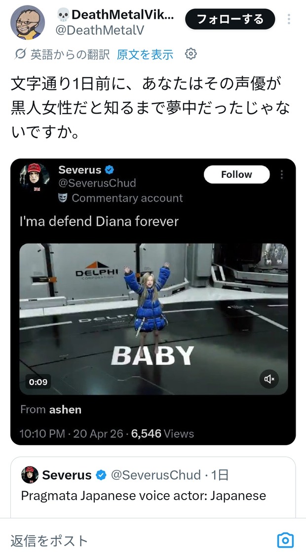 外人「プラグマタたのしい!ディアナかわいすぎ!!」→次の日外人「はぁ?声優が黒人なの?…ないわー」 Twitter Facebook はてブ LINE コピー 2026.04.23 スポンサーリンク 1 : 以下、?ちゃんねるからVIPがお送りします :2026/04/22(水) 20:16:28.732 ID:pN8IRHtaM.netやっぱり外人って変な思想に染まりすぎてるとおもうの🥺転載元スレッド:https://viper.2ch.sc/test/read.cgi/news4vip/1776856588/ 続きを読む
