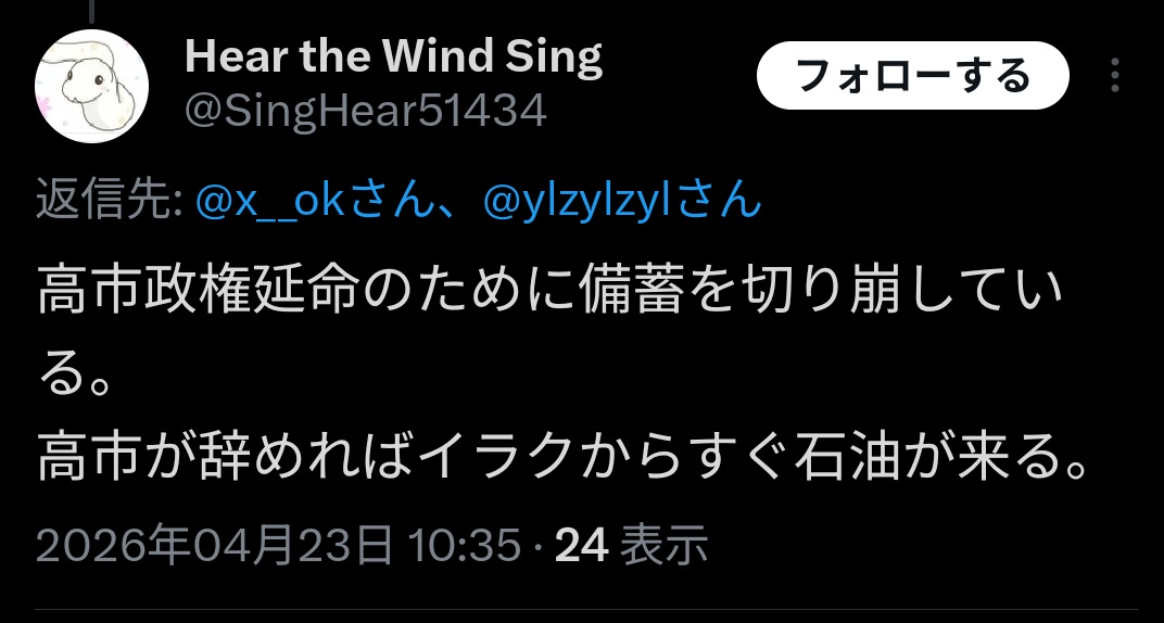 【?】パヨク「高市が辞めればイラクからすぐ石油が来る」 Twitter Facebook はてブ LINE コピー 2026.04.23 スポンサーリンク 1:2026/04/23(木) 17:51:28.67 ID:/5Tg+QIz0高市が辞めればイラクからすぐ石油が来る!?payokuは頭悪すぎる😂😂 pic.twitter.com/r8Bz0bbbP3— Bonjour AKIRA (@Bonjour4145) April 23, 2026転載元スレッド:https://hayabusa3.2ch.sc/test/read.cgi/news/1776934288/ 続きを読む