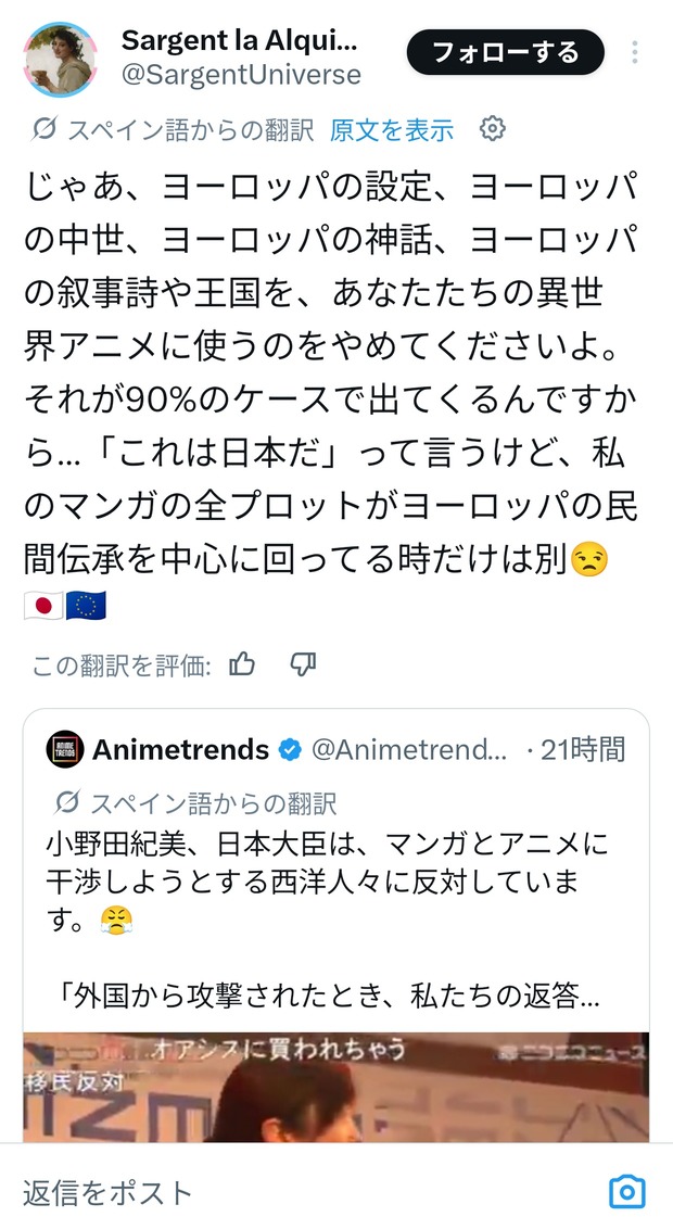 スペイン人「日本のマンガ大臣がLGBTを受け入れないって表明したけど、じゃあ異世界モノでヨーロッパの設定使うのをやめてよ」 Twitter Facebook はてブ LINE コピー 2026.04.28 スポンサーリンク 1 : 以下、?ちゃんねるからVIPがお送りします :2026/04/28(火) 05:01:33.874 ID:33UfVKWNM.netはい転載元スレッド:https://viper.2ch.sc/test/read.cgi/news4vip/1777320093/ 続きを読む