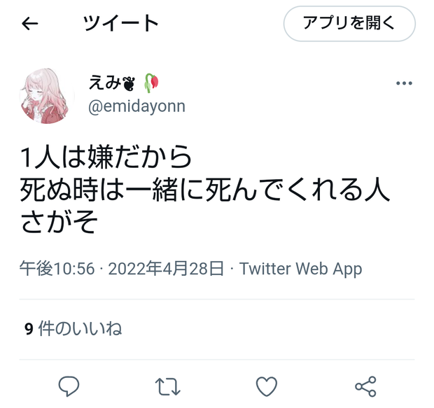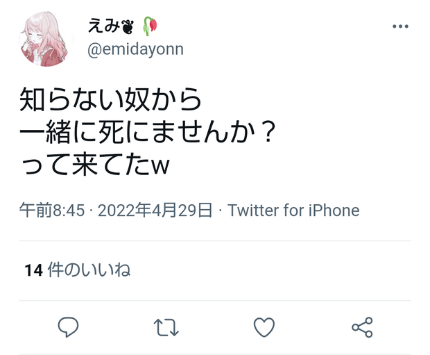 女「一緒に死んでくれる人さがそ → 知らん奴から一緒に死にませんかってDM来たんだけどw」 Twitter Facebook はてブ LINE コピー 2022.04.29 スポンサーリンク 1 : 風吹けば名無し :2022/04/29(金) 11:17:11.43 ID:g0G1TsBb0自分で言っておいてさすがにそれは無いだろ2 : 風吹けば名無し :2022/04/29(金) 11:17:24.83 ID:g0G1TsBb0転載元スレッド:https://eagle.5ch.net/test/read.cgi/livejupiter/1651198631/ 続きを読む