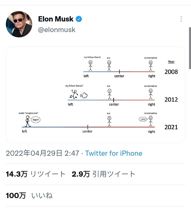 【朗報】パヨクが「日本人は右傾化してるゥ!」と倡えてた理由、イーロン・マスクによって解明される Twitter Facebook はてブ LINE コピー 2022.04.29 スポンサーリンク 1:2022/04/29(金) 12:11:23.96 ID:QyyEiTCG0pic.twitter.com/Q9OjlJhi7f— Elon Musk (@elonmusk) April 28, 2022転載元スレッド:https://eagle.5ch.net/test/read.cgi/livejupiter/1651201883/ 続きを読む