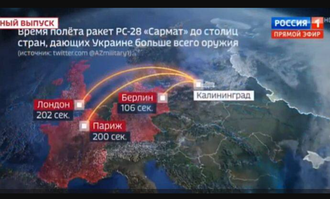 ロシアがウクライナでの軍事的屈辱の高まりに激怒する中、クレムリンTVは復讐を誓い、ヨーロッパの主要首都へのミサイル飛行時間を誇示しています。