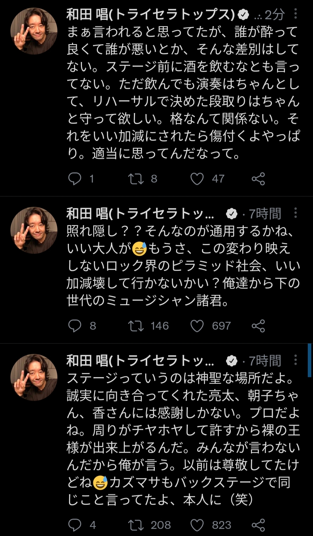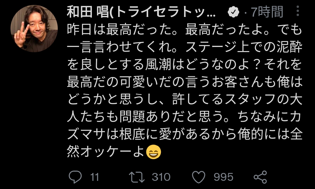 【悲報】上野樹里の旦那、フェスで泥酔してステージに上がった奥田民生にブチ切れwwwwwwwww Twitter Facebook はてブ LINE コピー 2022.05.02 スポンサーリンク 1:風吹けば名無し:2022/05/02(月) 09:44:32 2:風吹けば名無し:2022/05/02(月) 09:44:38 たぶん カズマサ=田中和将(GRAPEVINE) 朝子ちゃん=SHISHAMO 香さん=岸本香 亮太=レミオロメン 31:風吹けば名無し:2022/05/02(月) 09:51:24 >>2 岸谷香やほ 続きを読む
