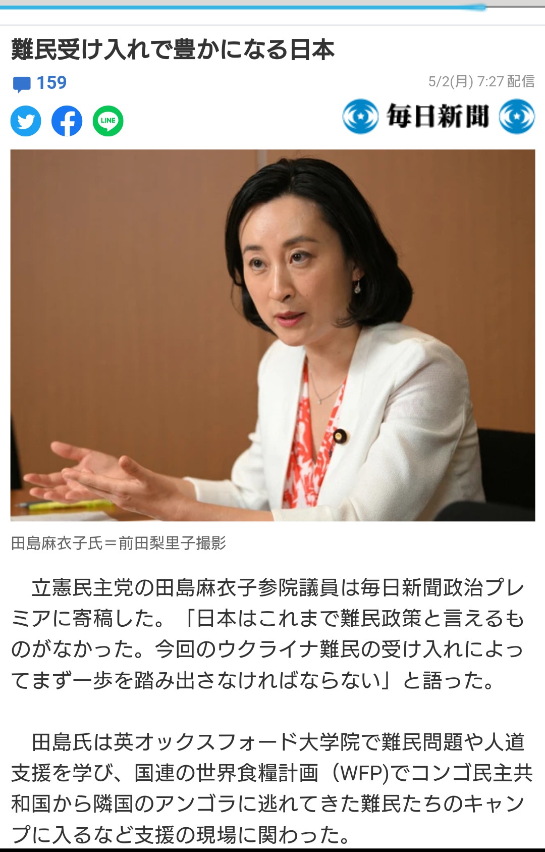 立憲民主党の田島麻衣子参院議員は毎日新聞政治プレミアに寄稿した。「日本はこれまで難民政策と言えるものがなかった。今回のウクライナ難民の受け入れによってまず一歩を踏み出さなければならない」と語った。