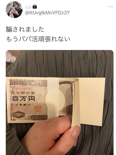 【画像】パパ活女子「こんなに貰っていいんですか!?ありがとうございます!!」→wwwwwwwww Twitter Facebook はてブ LINE コピー 2022.05.07 スポンサーリンク 1:風吹けば名無し:2022/05/07(土) 18:05:04 2:風吹けば名無し:2022/05/07(土) 18:05:11 ええんか… 3:風吹けば名無し:2022/05/07(土) 18:05:18 かわいそう 4:風吹けば名無し:2022/05/07(土) 18:05:38 100万円札草 続きを読む