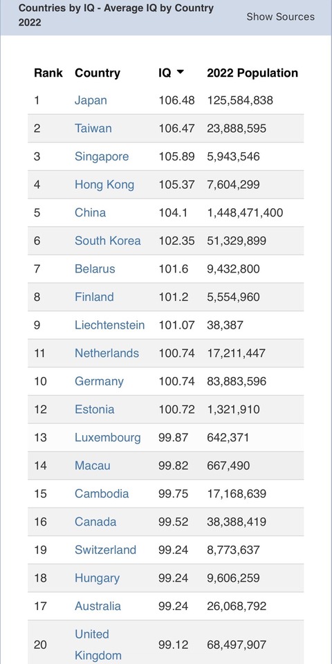 【画像】国別IQランキング2022が発表されるwwwwwwwwwww Twitter Facebook はてブ LINE コピー 2022.05.10 スポンサーリンク 1:以下、?ちゃんねるからVIPがお送りします:2022/05/08(日) 19:29:48 Countries by IQ - Average IQ by Country 2022 https://worldpopulationreview.com/country-rankings/average-iq-by-country 2:以下、?ちゃんねるからVIPがお送りします:2022/05/08(日) 19:30:42 インドとか高そうなイメージだけど 続きを読む
