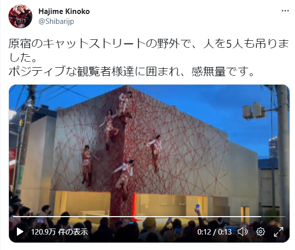 《原宿のキャットストリートの野外で、人を5人も吊りました。ポジティブな観覧者様達に囲まれ、感無量です》