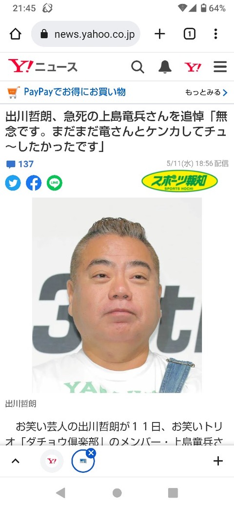 【画像】出川哲朗、鼻くそを見せながら上島竜兵への追悼コメントを発表wwwwwww Twitter Facebook はてブ LINE コピー 2022.05.12 スポンサーリンク 1:以下、?ちゃんねるからVIPがお送りします:2022/05/11(水) 21:47:24 2:以下、?ちゃんねるからVIPがお送りします:2022/05/11(水) 21:48:06 ワロタ 続きを読む