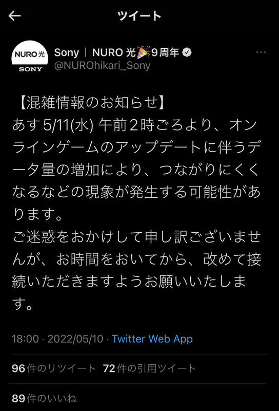 あす5/11(水) 午前2時ごろより、オンラインゲームのアップデートに伴うデータ量の増加により、つながりにくくなるなどの現象が発生する可能性があります。