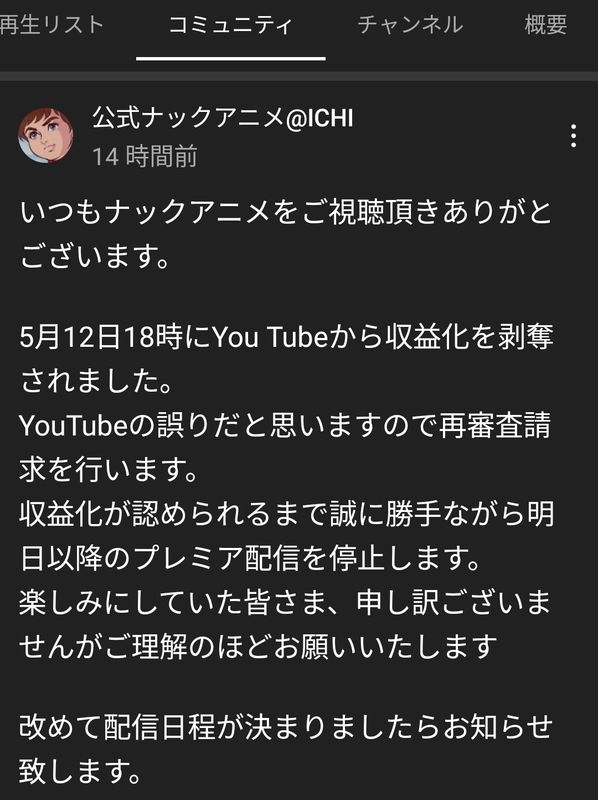 You Tubeから収益化を剥奪されました。YouTubeの誤りだと思いますので再審査請求を行います。収益化が認められるまで誠に勝手ながら明日以降のプレミア配信を停止します。楽しみにしていた皆さま、申し訳ございませんがご理解のほどお願いします