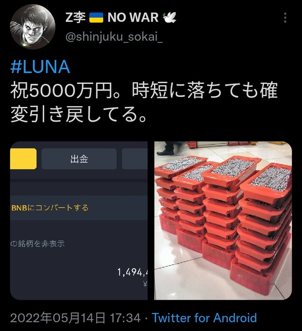 Z李さん、仮想通貨で5000万儲かってしまう Twitter Facebook はてブ LINE コピー 2022.05.15 スポンサーリンク 1 : 風吹けば名無し :2022/05/14(土) 17:58:21.45 ID:y4hjeIj3M#LUNA祝5000万円。時短に落ちても確変引き戻してる。 pic.twitter.com/xP4bVulHqg— Z李 🇺🇦 NO WAR 🕊 (@shinjuku_sokai_) May 14, 2022転載元スレッド:https://eagle.5ch.net/test/read.cgi/livejupiter/1652518701/ 続きを読む