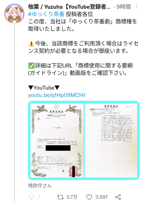 UUUM所属YouTuber「『ゆっくり』の商標取りました!今後は使用料を徴収します」大炎上wwwwwwwwwww Twitter Facebook はてブ LINE コピー 2022.05.15 スポンサーリンク 1::2022/05/15(日) 17:36:05.30 ID:XzU56eWp0 BE:633829778-2BP(2000) 続きを読む