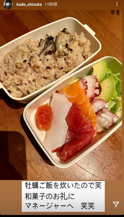 工藤静香さんの作った弁当がうますぎそうと話題wwやっぱトップアイドルはレベチやわ (※画像あり) Twitter Facebook はてブ LINE コピー 2022.05.18 スポンサーリンク 1:風吹けば名無し:2022/05/18(水) 00:10:52.08 ID:tM8KGppA0 3:風吹けば名無し:2022/05/18(水) 00:11:33.73 ID:QBH7kGV70 金はかかってるな 4:風吹けば名無し:2022/05/18(水) 00:11:38.96 ID:O2vR7KUj0 弁当に刺し身…? 5:風吹けば名無し:2022/05/18(水) 00:11:39.54 ID:f5w4FyHc0 牡蠣ご飯だけ食べたい 続きを読む