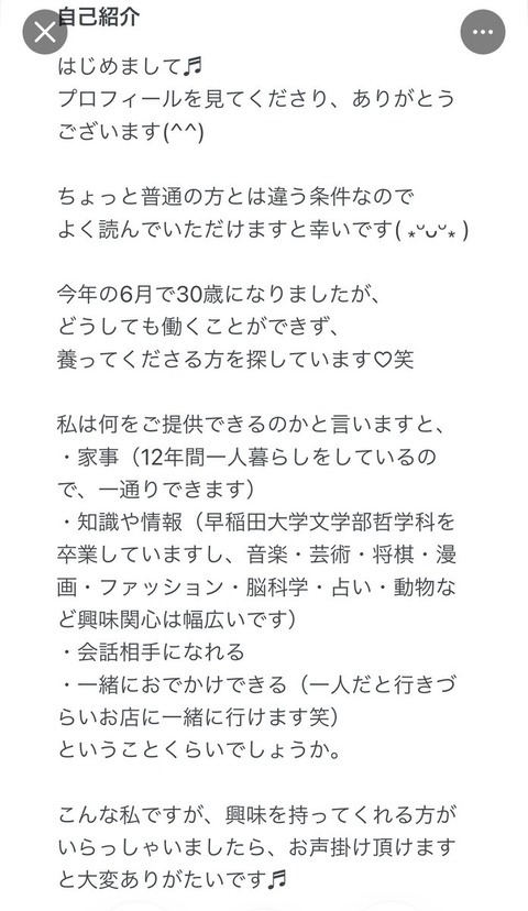 30歳女性さん「どうしても働くことができず養ってくださる方を探しています♡笑」 (※画像あり) Twitter Facebook はてブ LINE コピー 2022.05.19 スポンサーリンク 1:風吹けば名無し:2022/05/19(木) 14:17:52.15 ID:/7Y1t+Bf0.net 緑茶 @lisa_parmes 心底これが許される性別になりたい 3:風吹けば名無し:2022/05/19(木) 14:18:21.83 ID:EzLMu8LY0.net 底辺大学卒だけどいいすか? 4:風吹けば名無し:2022/05/19(木) 14:18:27.25 ID:JZgDRYqAM.net なぜ、働けないのでしょう? 5:風吹けば名無し:2022/05/19(木) 14:18:54.11 ID:v7OQF7Tja.net 早稲田卒で30歳で可愛い雰囲気やし全然ええやん 叩くとこないやろ 続きを読む