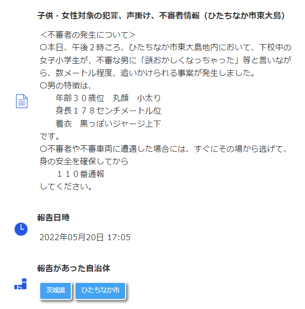子供・女性対象の犯罪、声掛け、不審者情報(ひたちなか市東大島)