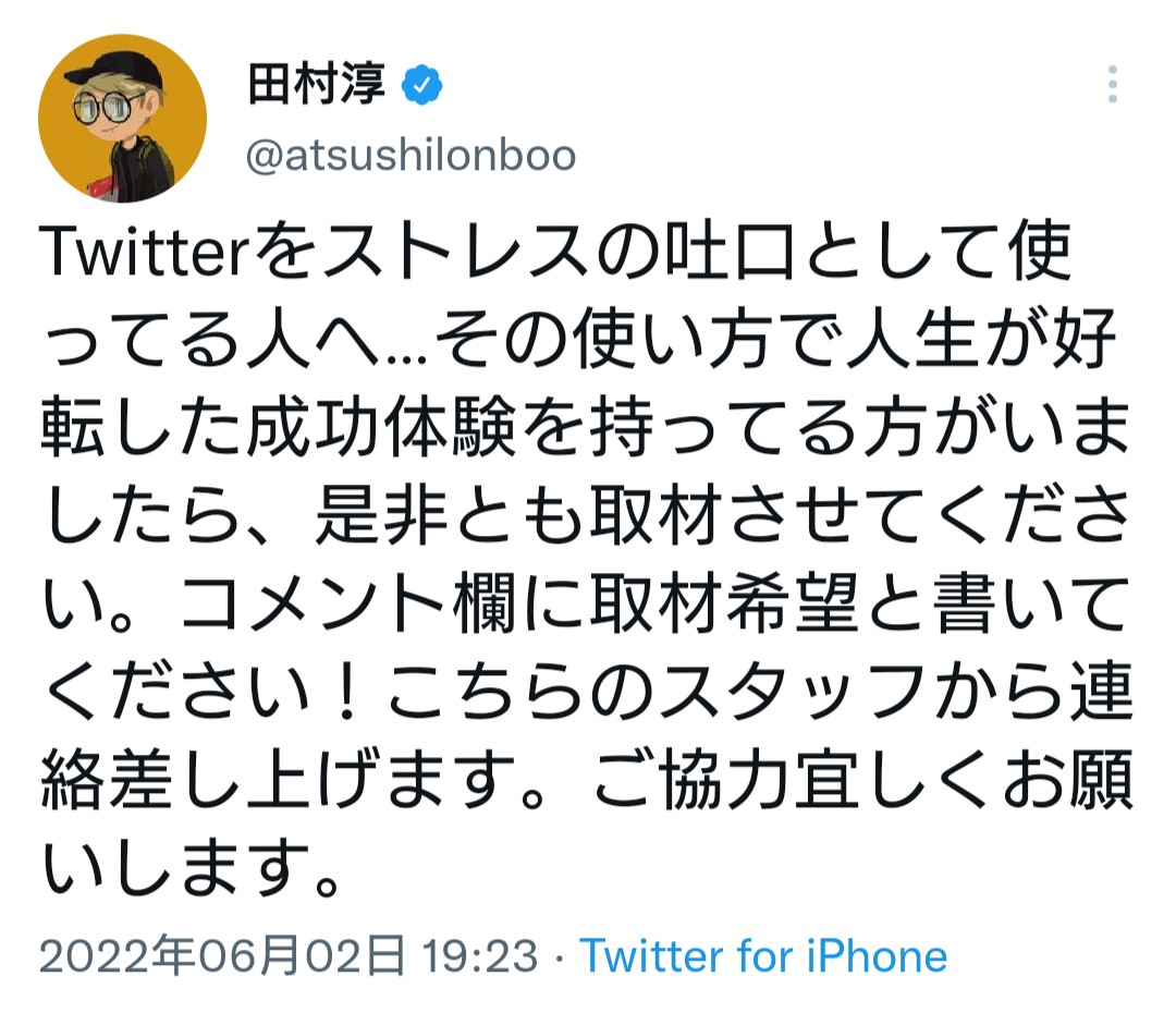 Twitterをストレスの吐口として使ってる人へ…その使い方で人生が好転した成功体験を持ってる方がいましたら、是非とも取材させてください。コメント欄に取材希望と書いてください!こちらのスタッフから連絡差し上げます。ご協力宜しくお願いします。