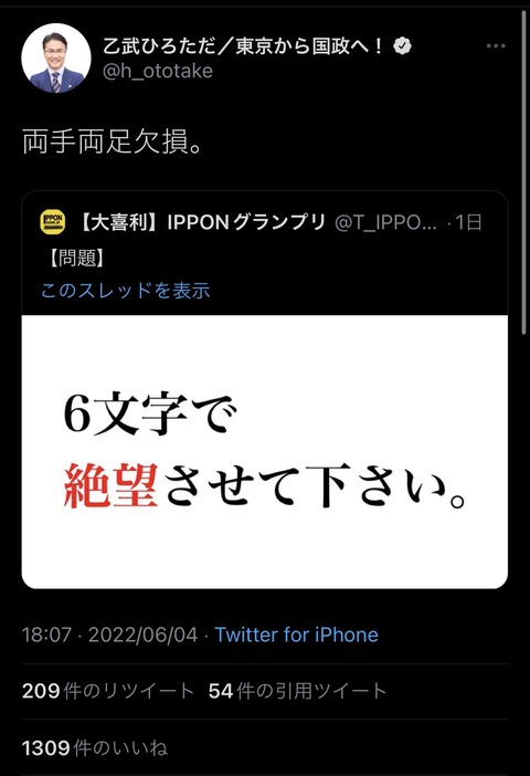 【悲報】乙武さん、IPPONグランプリに挑戦するも滑るwwwwwwww Twitter Facebook はてブ LINE コピー 2022.06.07 スポンサーリンク 1:風吹けば名無し:2022/06/05(日) 12:23:43.13 ID:dURhB4LC0.net 笑いのセンスはあんまりみたいやな 2:風吹けば名無し:2022/06/05(日) 12:24:18.28 ID:ZHiU8lCO0.net 笑わなきゃって空気がだめ 3:風吹けば名無し:2022/06/05(日) 12:24:26.06 ID:WU1wyJ0Ia.net 笑えないからね 4:風吹けば名無し:2022/06/05(日) 12:24:34.41 ID:Hd71Ne+0d.net ハードすぎるとつまらんのよ 続きを読む