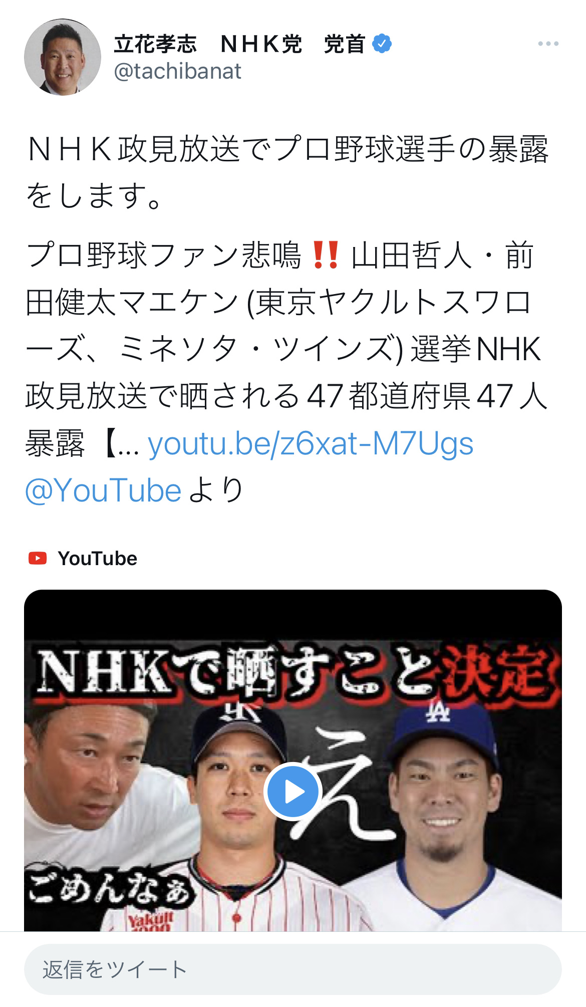山田哲人とマエケン、NHK政見放送で暴露される模様 Twitter Facebook はてブ LINE コピー 2022.06.07 スポンサーリンク 1: それでも動く名無し 2022/06/07(火) 14:33:22.66 ID:OVcorYh1a 草 3: それでも動く名無し 2022/06/07(火) 14:34:14.50 ID:1iLBu70KM もうめちゃくちゃだよ 9: それでも動く名無し 2022/06/07(火) 14:35:28.36 ID:h3ccjNGZa 政見放送の主旨とは🤔 続きを読む