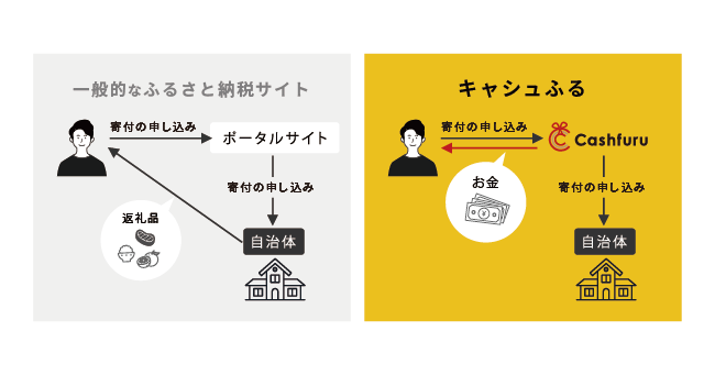 一般的なポータルサイトでは返礼品がもらえますが、キャシュふるでは返礼品の代わりに、寄付金額の20%のお金がもらえることが最大の違いです。